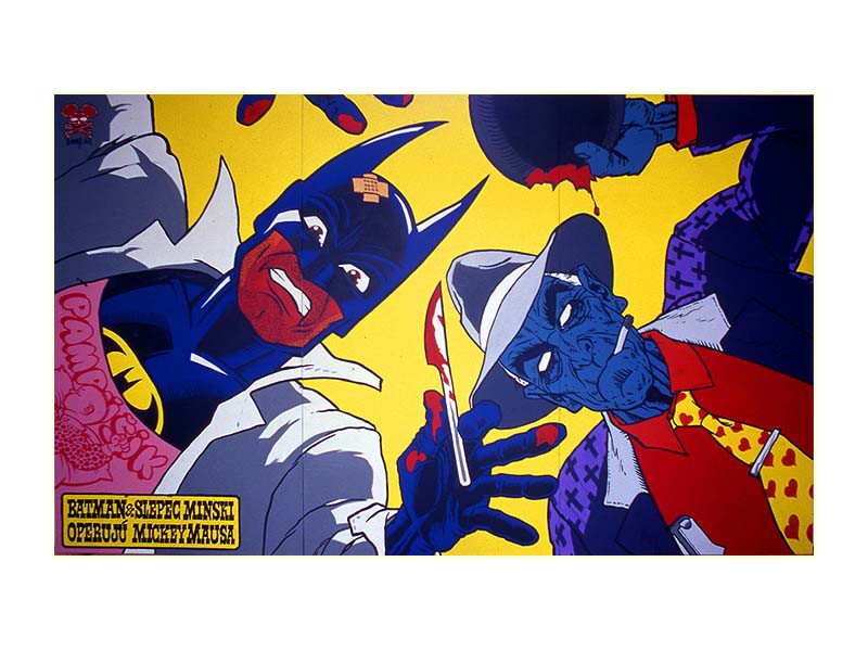 Batman a slepec Minski operují Mickey Mouse / Batman and a blind man operating om Mickey Mouse, Jozef Danglár Gertli, 240 × 360 cm, akryl, plátno / acrylic, canvas